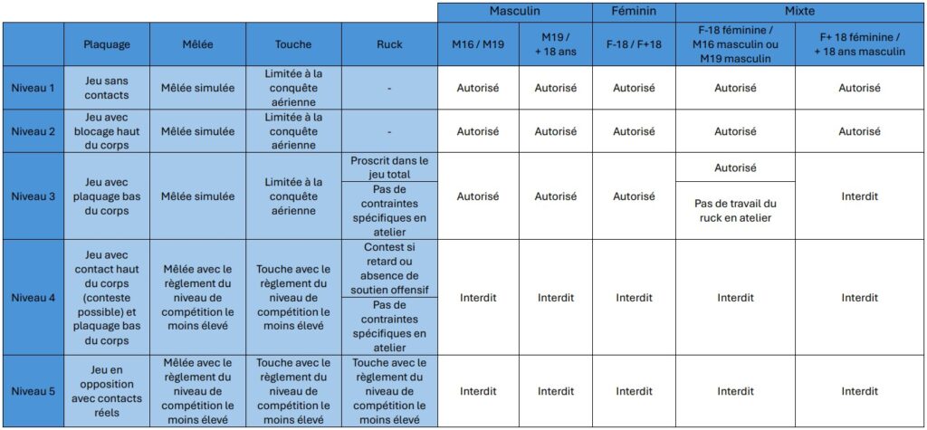 Après avis favorable du Comité Médical et des assureurs de la FFR, le Comité d’Orientation Politique, lors de sa réunion du 3 juillet 2025, a adopté le nouveau cadre de pratique figurant dans le tableau ci-dessous.